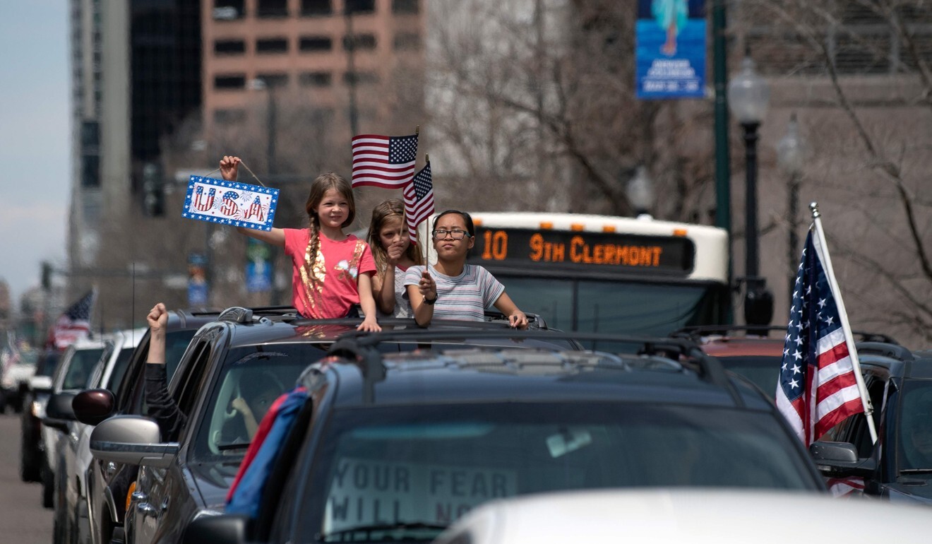 | Girls hold US flags as demonstrators gather to protest against coronavirus stay-at-home orders during a rally in Denver, Colorado, on April 19. Photo: AFP |