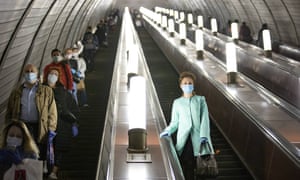 People wear face masks and gloves on the Moscow Metro. Russia now finds itself with the second fastest rate of Covid-19 infections in the world. Photograph: Alexander Zemlianichenko/AP